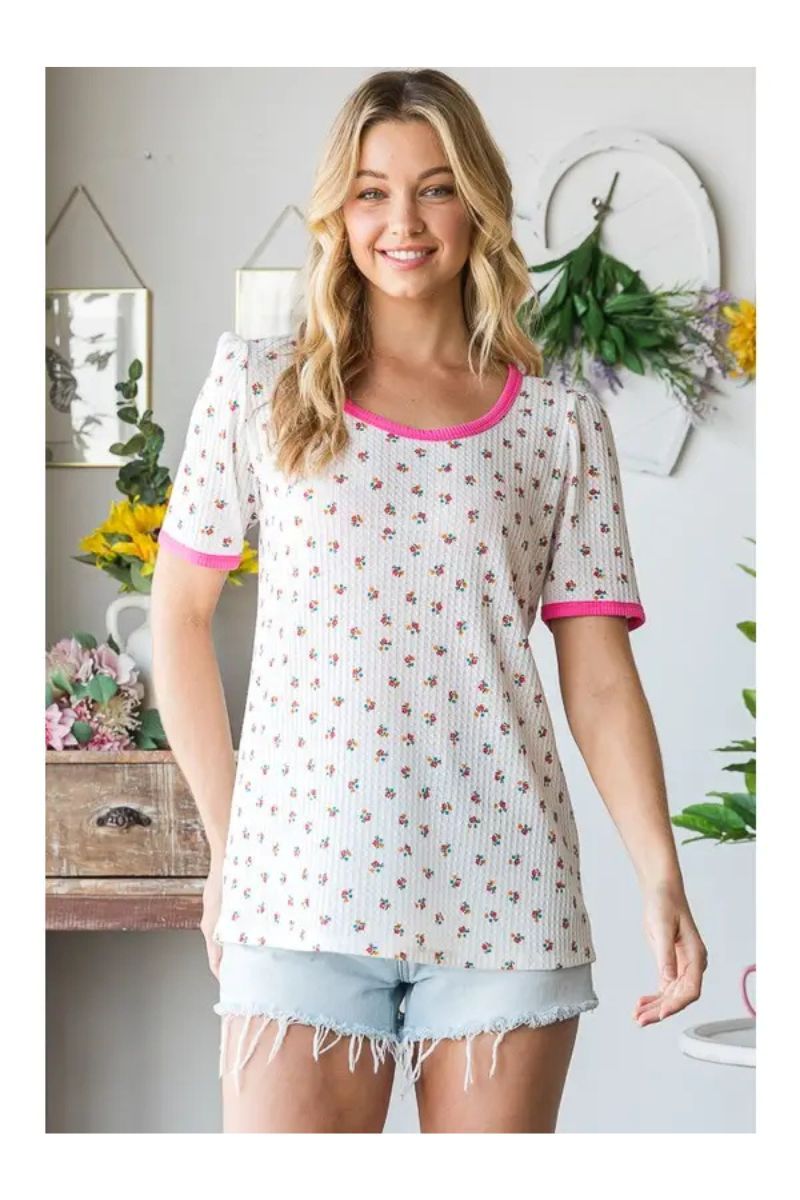 Women’s Ditsy Floral Tee – Contrast Trim Round Neck Short-Sleeve Knit Top