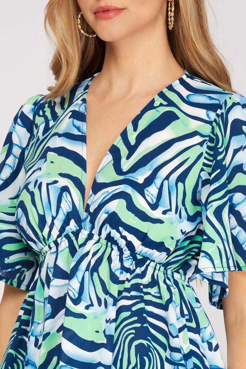 Women’s Printed Chiffon Blouse – Deep V-Neck Smocked Empire Waist Top with Flutter Sleeves